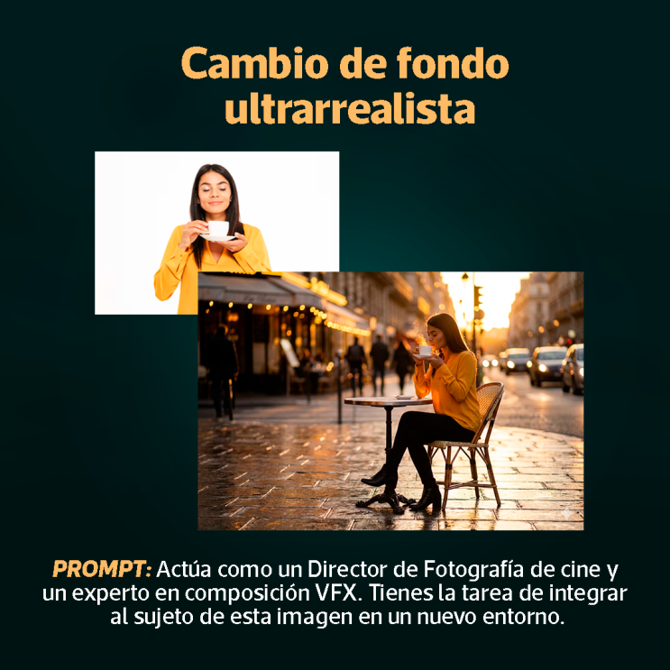 Hoy, cambiar el fondo de una foto es algo que cualquiera puede hacer. Pero hacerlo con resultado profesional requiere intención, buenos prompts y criterio visual.