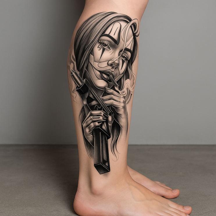 Recrear fielmente el tatuaje de la imagen proporcionada. Es un diseño en blanco y negro ubicado en la pantorrilla. El tatuaje muestra el rostro estilizado de una mujer, dividido por líneas curvas decorativas, con mirada intensa y expresión seria. Tiene mechones de cabello largo alrededor del rostro. La mujer sostiene una pistola grande con la mano en primer plano, con dedos definidos. Tiene un cigarro en la boca y el humo rodea su rostro. El estilo es realista con toques neo-chicano, sombreado suave, dotwork, líneas limpias, alto contraste y composición vertical que ocupa toda la pantorrilla. Reproducir la misma estética, proporciones y detalles que en la imagen suministrada