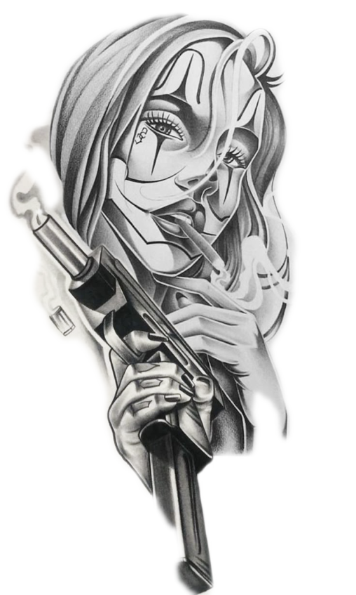 Recrear fielmente el tatuaje de la imagen proporcionada, pero ubicado en el brazo. El diseño es en blanco y negro y muestra el rostro estilizado de una mujer dividido por líneas curvas decorativas, con mirada intensa y expresión seria. Cabello largo rodeando el rostro. La mujer sostiene una pistola grande con la mano en primer plano, con dedos definidos. Tiene un cigarro en la boca y el humo rodea su rostro. Estilo realista con toques neo-chicano, sombreado suave, dotwork, líneas limpias, alto contraste. Reproducir la misma estética, proporciones y detalles que en la imagen, pero adaptado a la forma del brazo en una composición vertical y envolvente.